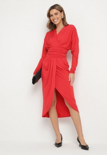 Czerwona Sukienka Kopertowa z Wiskozą Zdobiona Marszczeniem Edivana