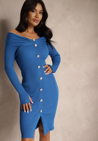 Niebieska Koktajlowa Sukienka Sweterkowa z Wiskozą Ozdobiona Rozcięciem na Kciuk i Guzikami Yasedi