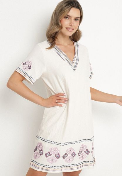 Fioletowa Sukienka Bawełniana o Pudełkowym Fasonie Ozdobiona Haftami Tirkio