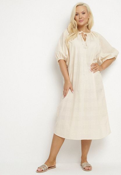 Beżowa Bawełniana Sukienka Oversize z Wiązaniem pod Szyją Tolanea