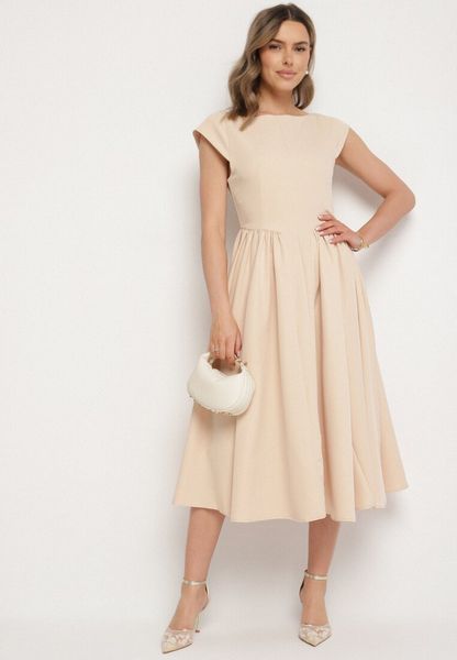 Beżowa Rozkloszowana Sukienka Vices z Dekoltem Typu Łódka Milasena