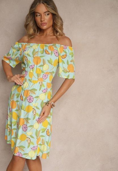 Jasnoniebieska Sukienka Typu Hiszpanka z Bawełną ze Wzorem Cytrusów Aprona