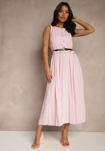 Różowa Plisowana Sukienka o Rozkloszowanym Kroju Bez Rękawów z Paskiem z Klamrą Iffule