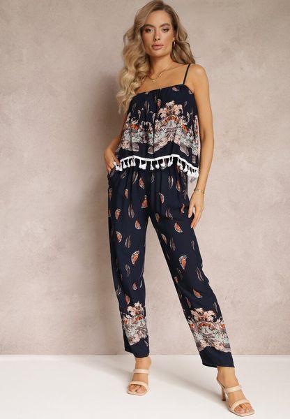 Kombinezon Picture of You z opadającą, długą falbaną zakończoną frędzlami, z prostym dekoltem. Na cienkich, regulowanych ramiączkach. Z długimi nogawkami i wsuwanymi kieszeniami. Ozdobiony oryginalnym wzorem. Szukasz ciekawego, lekkiego kombinezonu na wiosnę i lato? Ten będzie świetny!