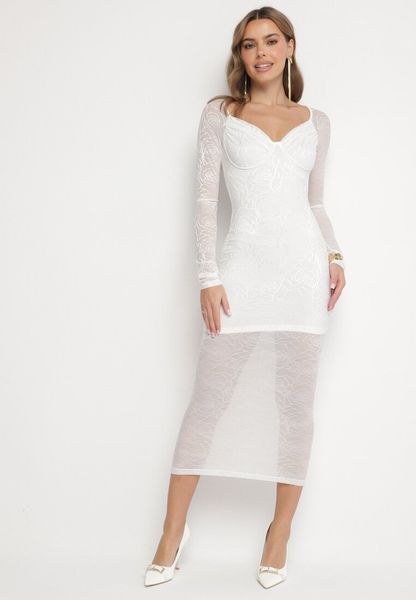 Biała Dopasowana Sukienka z Siateczki z Ozdobnym Marszczeniem Emiraniae