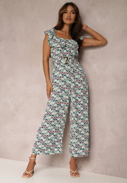 Kombinezon Ameline z tkaniny w geometryczny wzór. Dekolt głęboki, hiszpański, ozdobiony falbanką. Model z długimi, rozszerzanymi nogawkami. W pasie znajduje się wszyta gumka oraz dodatkowy pasek materiałowy do wiązania. Uroczy kombinezon w casualowym stylu będzie świetnie wyglądał w komplecie z sandałami na wysokim obcasie oraz lekką, letnią torbą na ramię. Prawdziwy must have!