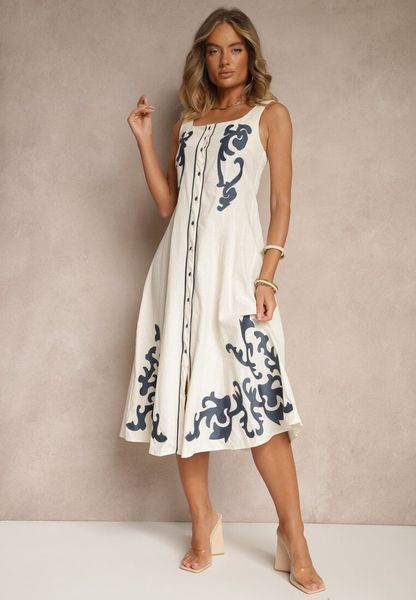 Beżowa Bawełniana Sukienka z Guzikami i Haftami Milonellea