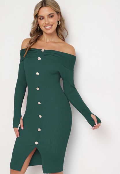 Zielona Sweterkowa Sukienka Koktajlowa z Wiskozą Ozdobnymi Guzikami i Rozcięciem na Kciuk Faledi