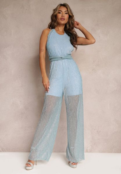 Niebieski Kombinezon Wiązany na Szyi z Błyszczącą Nitką i Gumką w Pasie Erinta