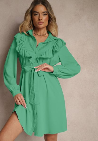 Ciemnozielona Rozkloszowana Sukienka Koszulowa z Falbankami i Koronką Naik