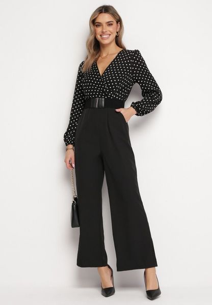 Czarny Kombinezon z Paskiem i Kopertowym Dekoltem z Szeroką Nogawką Omera