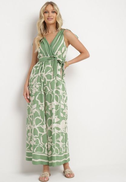 Zielony Kopertowy Kombinezon z Wiskozą Wykończony Gumką w Talii z Materiałowym Paskiem Inatia