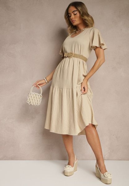 Jasnobeżowa Rozkloszowana Sukienka z Wiskozy z Dekoltem w Serek Natasella