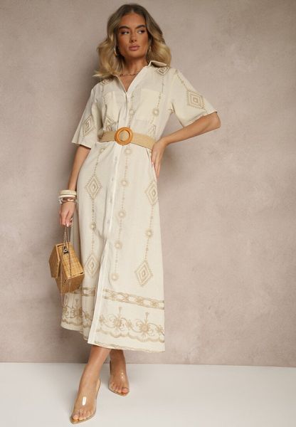 Beżowa Koszulowa Sukienka z Bawełny z Plecionym Paskiem Sariene