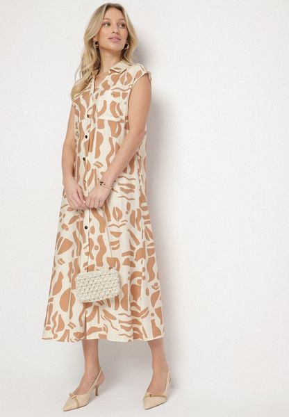 Beżowa Sukienka o Koszulowym Kroju w Geometryczny Wzór Saranea