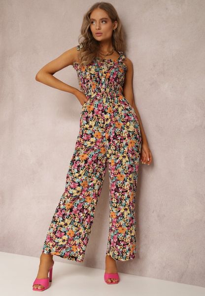 Kombinezon Laodena o luźnym kroju, z szerokimi oraz długimi nogawkami. Góra zdobiona cienkim gumkami, które tworzą dopasowany i elastyczny fason. Szerokie ramiączka, wiązane w kokardę na ramionach. Pokryty efektownym printem w kwiaty. Po bokach wsuwane kieszenie. Przy dekolcie ozdobne guziki. Ciekawy wzór doda charakteru każdej stylizacji. Must-have na sezon wiosenno-letni!