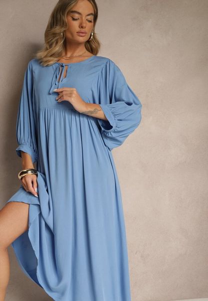 Niebieska Wiskozowa Sukienka o Rozkloszowanym Kroju Wiązana przy Dekolcie Tilvessa