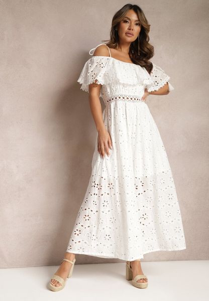 Biały Haftowany Kombinezon na Ramiączkach z Falbanką i Ażurową Wstawką Firlena