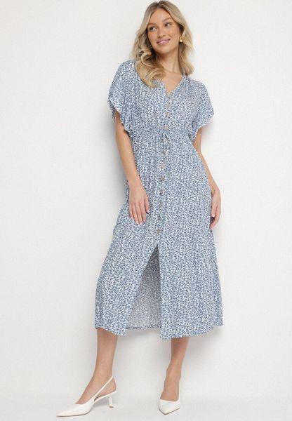 Niebieska Bawełniana Sukienka Rozkloszowana w Cętki z Ozdobnymi Guzikami Alulune