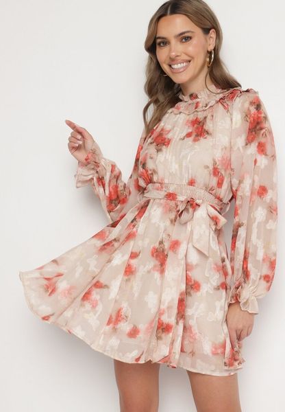 Beżowo-Różowa Koktajlowa Sukienka z Paskiem w Kwiaty Falresia