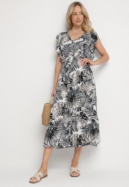 Biało-Czarna Rozkloszowana Sukienka we Florystyczny Print z Bawełny Lanioreta