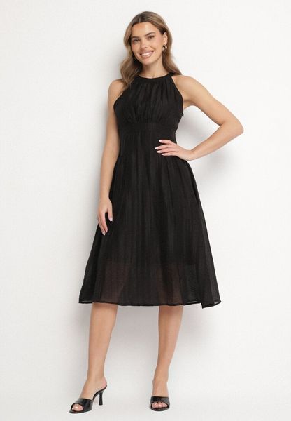 Czarna Rozkloszowana Sukienka z Tłoczonej Tkaniny z Wiązaniem z Tyłu Nimioretta