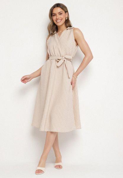 Beżowa Sukienka o Koszulowym Kroju Bez Rękawów z Wiązanym Paskiem Liriora