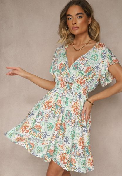 Jasnozielona Kwiatowa Kopertowa Sukienka z Bawełny Ulosiana