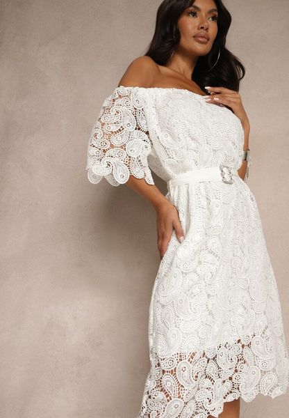Biała Sukienka z Bawełną z Paskiem z Klamrą Perełkami i Cyrkoniami Neralisse