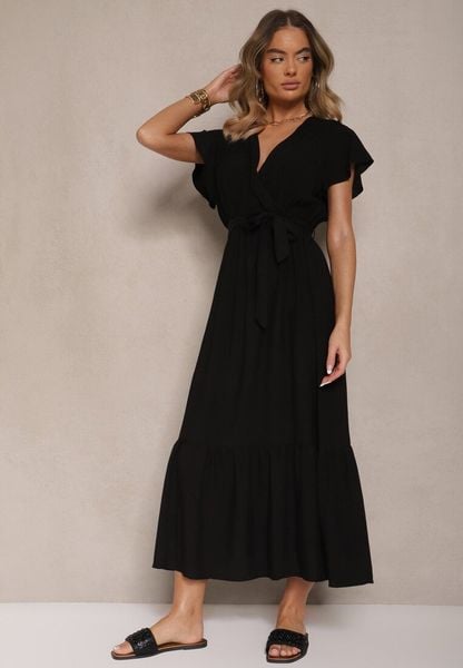 Czarna Kopertowa Sukienka z Wiskozy Ozdobiona Paskiem Savioneira