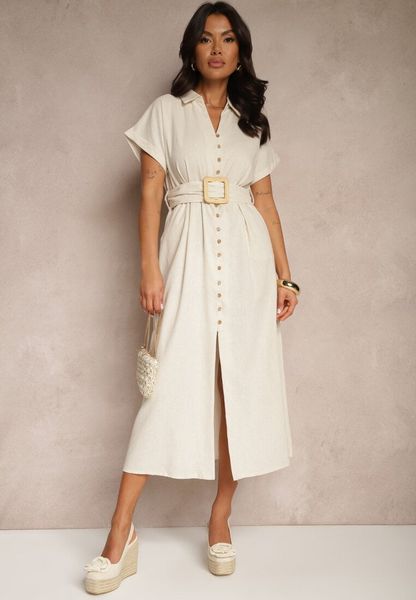 Jasnobeżowa Koszulowa Sukienka z Bawełny na Krótki Rękaw z Materiałowym Paskiem Celirna