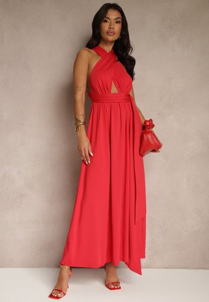 Czerwona Sukienka Koktajlowa Multiway z Wiskozą Wiązana na Szyi Lilovea