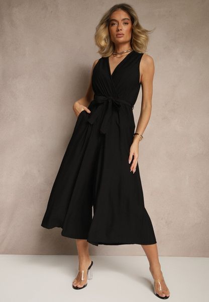 Czarny Kombinezon Taliowany z Wiskozą Ozdobiona Paskiem Evintria
