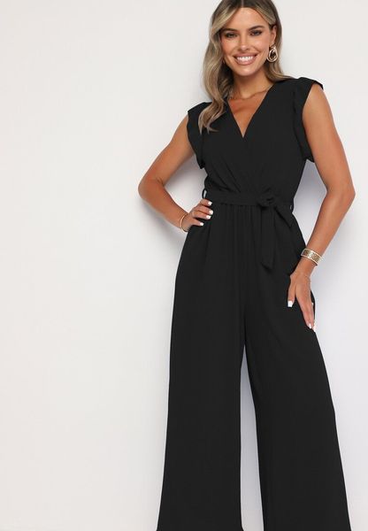 Czarny Taliowany Kombinezon Koktajlowy z Paskiem w Talii i Falbanami przy Ramionach Vimarine