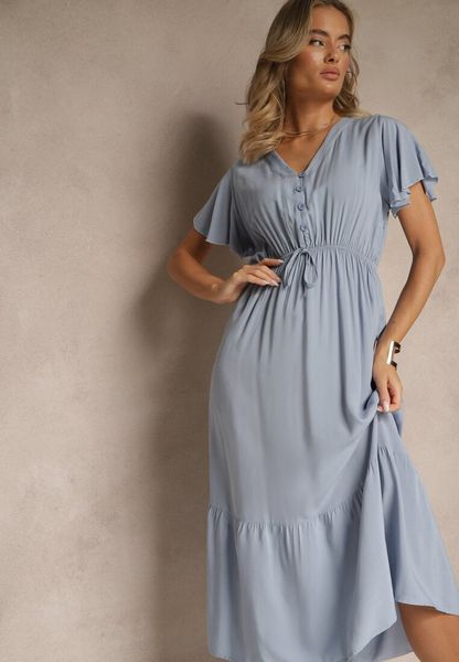Niebieska Rozkloszowana Sukienka z Bawełny Zdobiona Guzikami Folennea