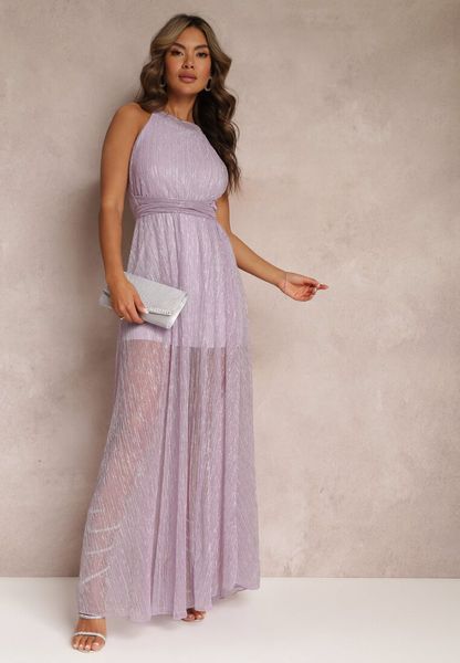 Fioletowa Sukienka z Dekoltem Halter Błyszczącą Nicią i Gumką w Pasaie Ketura