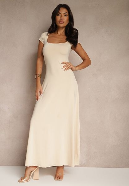 Jasnobeżowa Rozkloszowana Sukienka z Wiskozą z Kwadratowym Dekoltem Nalorina