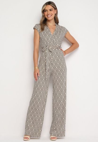 Beżowo-Czarny Kombinezon z Wiskozą Wiązany w Pasie Sosofia
