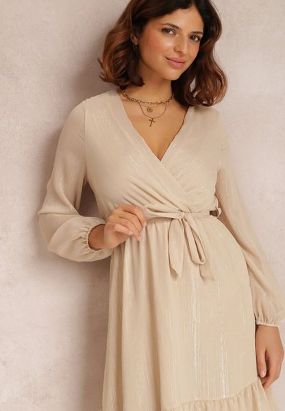 Sukienka Iphina mini, z dołem zdobionym delikatną falbaną. O lekko rozkloszowanym fasonie. W całości pokryta delikatną, metaliczną nitką. Z gumką w pasie, która efektownie podkreśla talię. Dodatkowo wyposażona w materiałowy pasek. Z kopertowym, trójkątnym dekoltem i długim rękawem. To szykowna sukienka łącząca styl elegancki z koktajlowym!