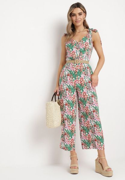 Zielony Kombinezon z Długimi Nogawkami Wiązanymi Ramiączkami i Abstrakcyjnym Printem Izara