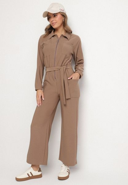 Ciemnobeżowy Kombinezon z Gumką i Wiązaniem w Talii z Szerokimi Nogawkami Creza