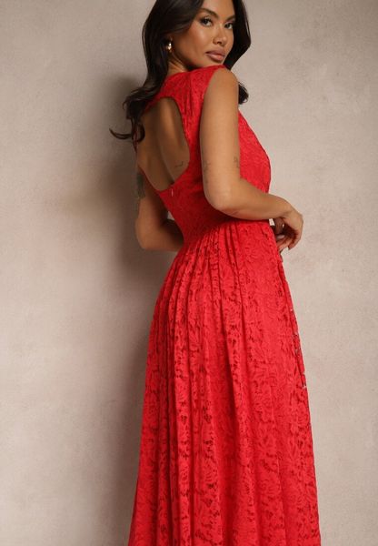 Czerwona Rozkloszowana Sukienka z Koronki z Wycięciem na Plecach Meltewia