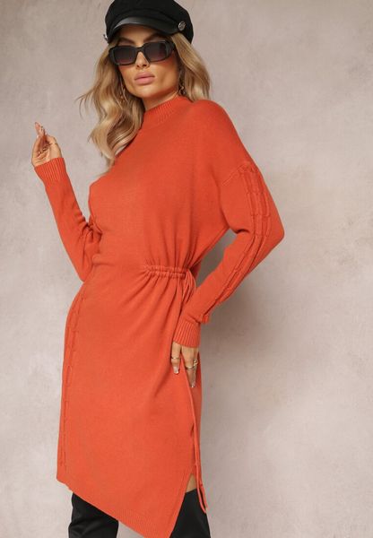 Pomarańczowa Mini Pudełkowa Sukienka ze Sznurkiem w Talii oraz Półgolfem Agaira