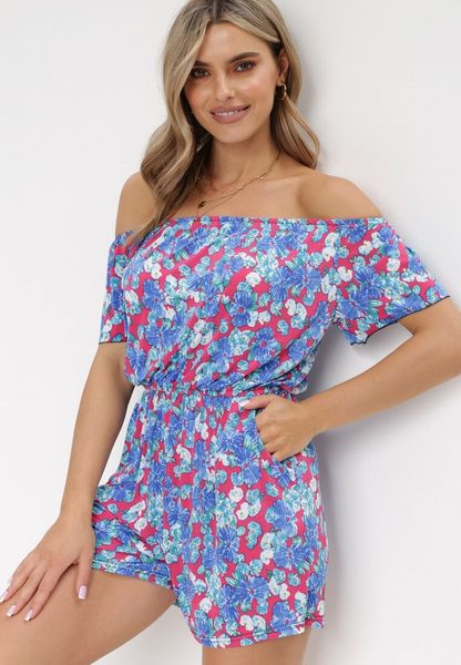 Niebiesko-Czerwoni Kombinezon w Kwiaty z Hiszpańskim Dekoltem i Gumką w Talii Eleanodora