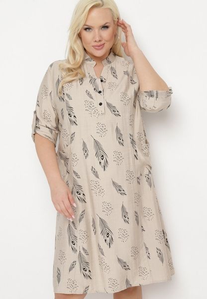 Beżowa Sukienka Szmizjerka z Guzikami przy Dekolcie z Podwijanymi Rękawami Ketella