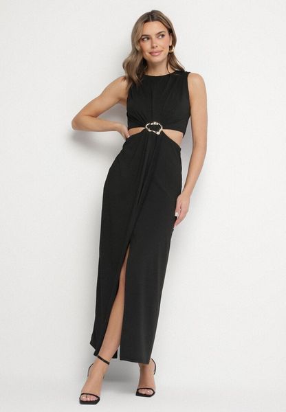 Czarna Sukienka z Wiskozą Ozdobiona Wycięciami i Metalową Aplikacją Odivaria
