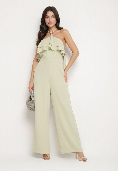 Zielony Kombinezon Wiązany na Szyi z Metaliczną Ozdobą Tilindra