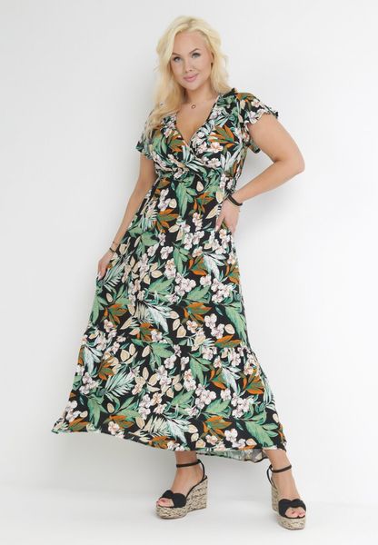 Czarno-Zielona Sukienka w Kwiaty z Falbankami i Gumką w Pasie Galbasi
