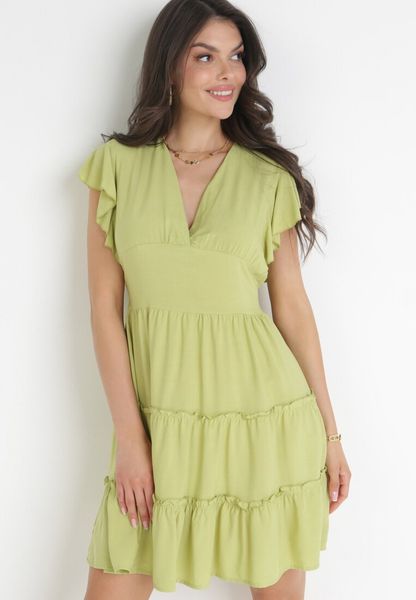 Jasnozielona Gładka Sukienka Mini Taliowana z Falbankami Wokół Ramion Zynnas