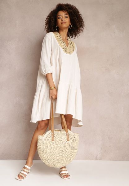 Sukienka Rufta to idealna propozycja do letniej stylizacji boho. Fason o długości mini z falbanką na dole, rozkloszowany. Udekorowana plecionką z koralikami na wysokości dekoltu.